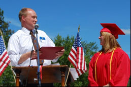 Representative Greg Smith presents Brandi Lee Martin with an award at the first ever high school graduation for Troy School.